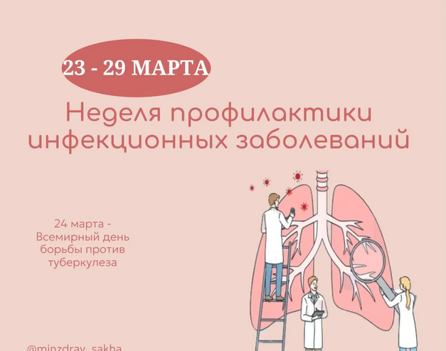 «Инфекционные заболевания возникают в результате воздействия болезнетворных микроорганизмов на организм человека и могут передаваться от инфицированного к здоровому. По данным Всемирной организаций здравоохранения, инфекции остаются одной из значимых причин заболеваемости во всём мире, однако большинство из них можно предотвратить при соблюдении простых профилактических мер. Особое место в профилактической работе занимает борьба с туберкулёзом. В этом году в медицинских учреждениях Якутии объявлен Месячник борьбы с туберкулёзом, который пройдёт с 24 марта по 24 апреля. Его цель — повышение санитарной грамотности населения, информирование о современных методах диагностики и лечения, а также формирование приверженности к здоровому образу жизни», – отметили в министерстве здравоохранения республики.